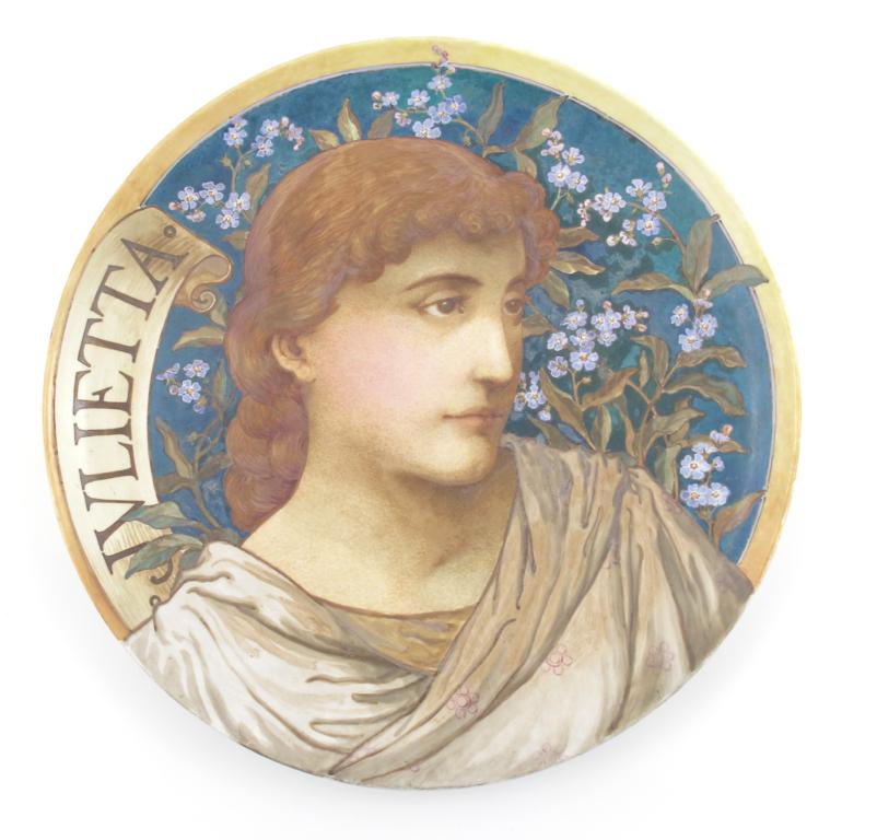 'Julietta' an Aesthetic Movement charger, possibly Minton's Kensington Gore Studio, painted with a Pre-Raphaelite portrait before forget-me-not flowers, in colours impressed marks flooded with glaze 36.5cm. diam.