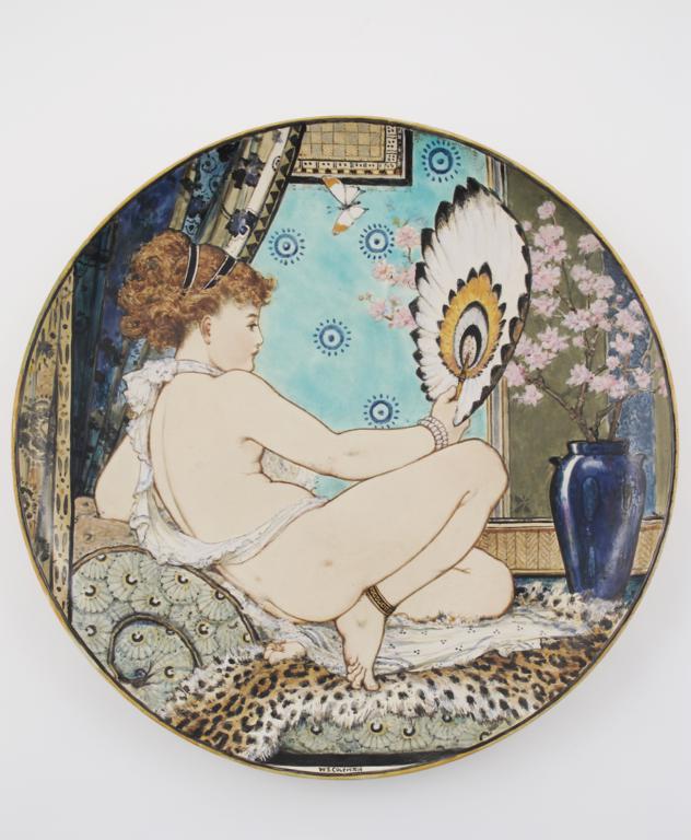A Minton's Art Pottery Studio charger by William S Coleman, painted with a female nude reclining on a leopard fur bed, holding a feather fan, in an Aesthetic interior with prunus spray floral display and a butterfly, painted in colours, printed factory mark, signed to the front, chip to foot rim, minor repairs to rim 39cm. diam.