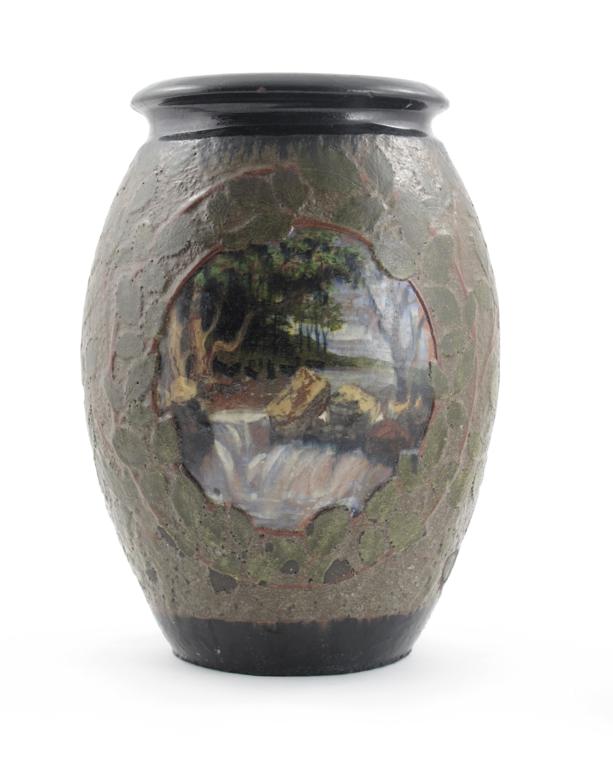 A large Lauder & Smith terracotta vase, dated 1888, modelled in low relief with ivy leaf roundels, painted with rustic landscape in colours incised marks, glaze chips 42cm. high