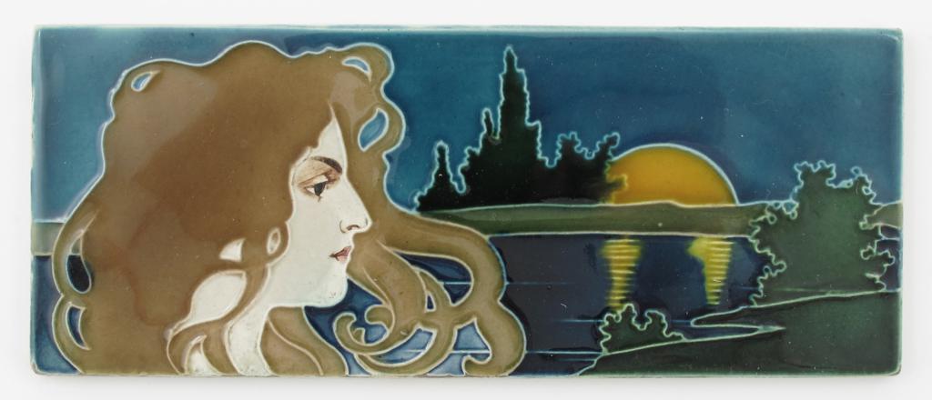 A German Art Nouveau tile, rectangular, moulded with raised outline with an Art Nouveau maiden before a lakeside landscape and setting sun incised 697 19 x 7.5cm.
