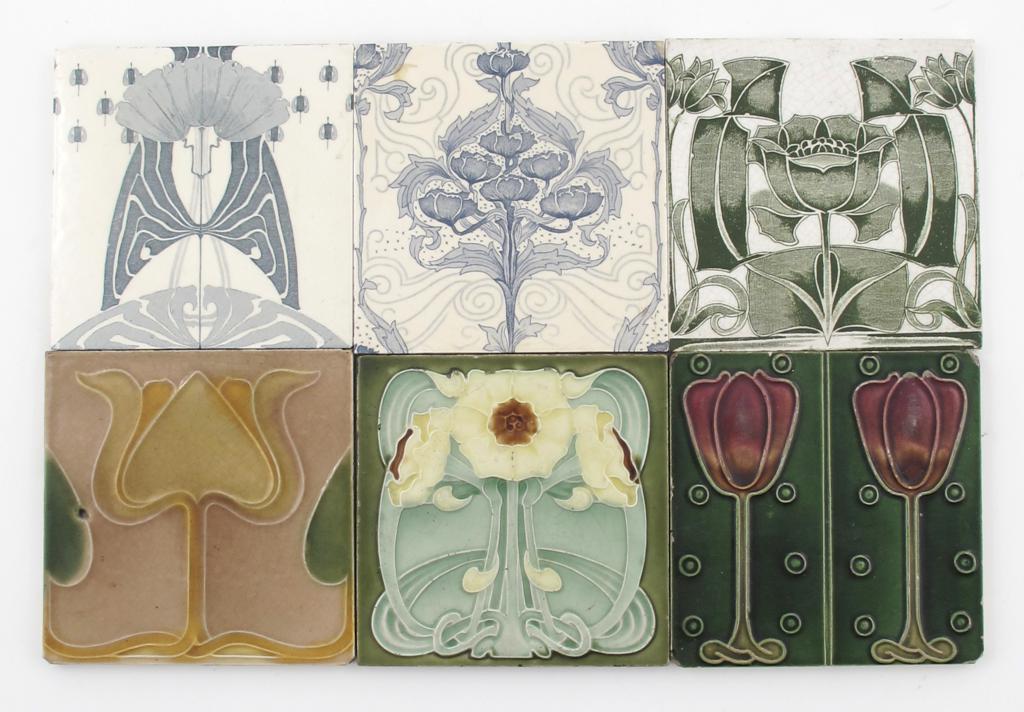A Mintons Secessionist tile designed by Leon Solon and John Wadsworth, decorated with a stylised flower in yellow and green on a mushroom ground, another similar and four other Art Nouveau tiles 15.5cm. square