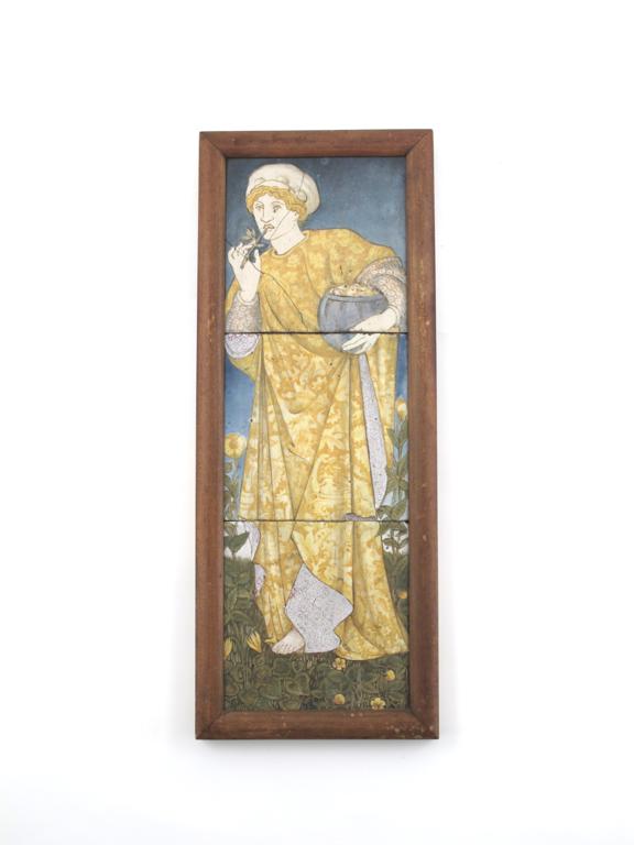 'Medea' a rare Morris & Co three tile panel, designed by Sir Edward Coley Burne-Jones, glazed earthenware, painted with a figure holding a pot and a sprig of leaves, framed in original wood frame stamped Morris & Co to reverse, damages tiles 45 x 15cm.