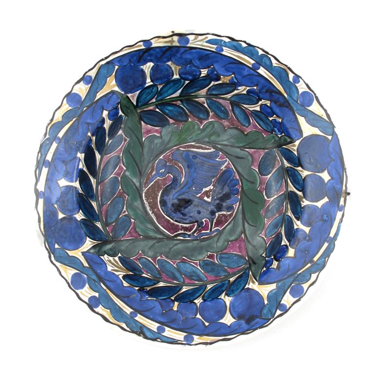A John Pearson plate, painted to the well with a mythical bird, in shades of blue, green and purple lustre, highlighted in gilt, the reverse painted with beasts painted monogram, hairline crack to rim 27cm. diam.