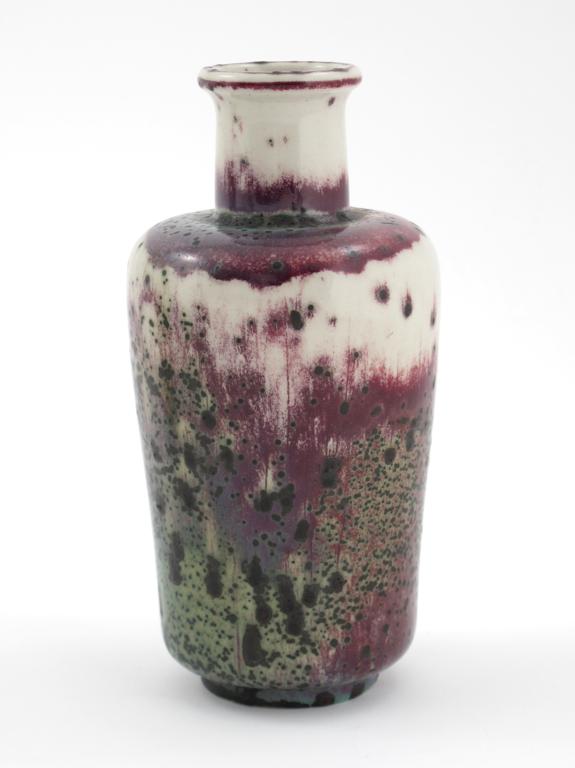 A Ruskin Pottery high-fired stoneware vase, dated 1906, shouldered form, covered in a white glaze over sang de boeuf and lavender, speckled with mint green impressed marks, 19cm. high