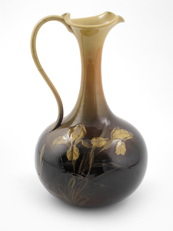 A large Rookwood Pottery jug by A R Valentien, ovoid with waisted cylindrical neck and everted rim, painted with flag iris in colours on a graduated yellow to brown glaze impressed and incised marks, handle re-stuck, 34cm. high