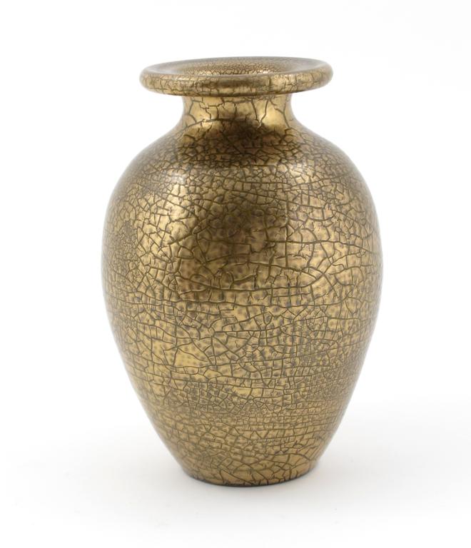 A Sunflower Pottery vase designed by Sir Edmund Elton, shouldered form with everted rim, covered in a golden crackled glaze painted Elton mark, 20cm. high