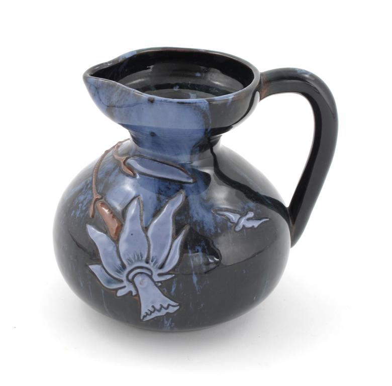A Sunflower Pottery jug by Sir Edmund Elton, ovoid form, slip decorated with a blue narcissus design on a streaked blue ground painted Elton signature 15cm. high