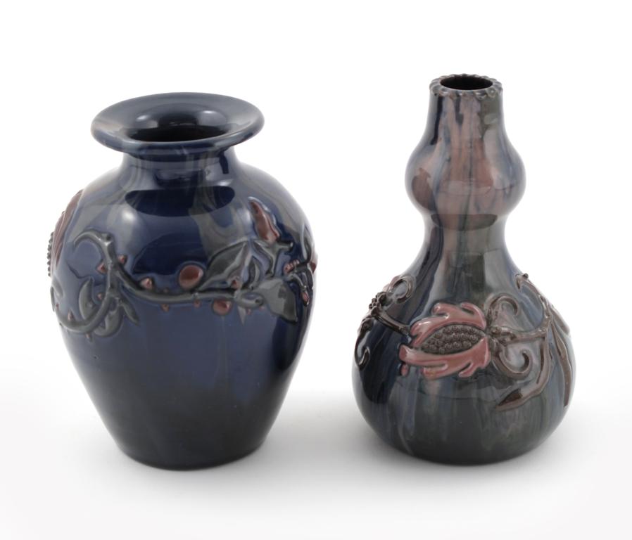 A Sunflower Pottery vase by Sir Edmund Elton, shouldered form with everted rim, slip decorated with flowers and foliage in red and green on a streaked blue and green ground, and another similar painted Elton mark 14cm. high