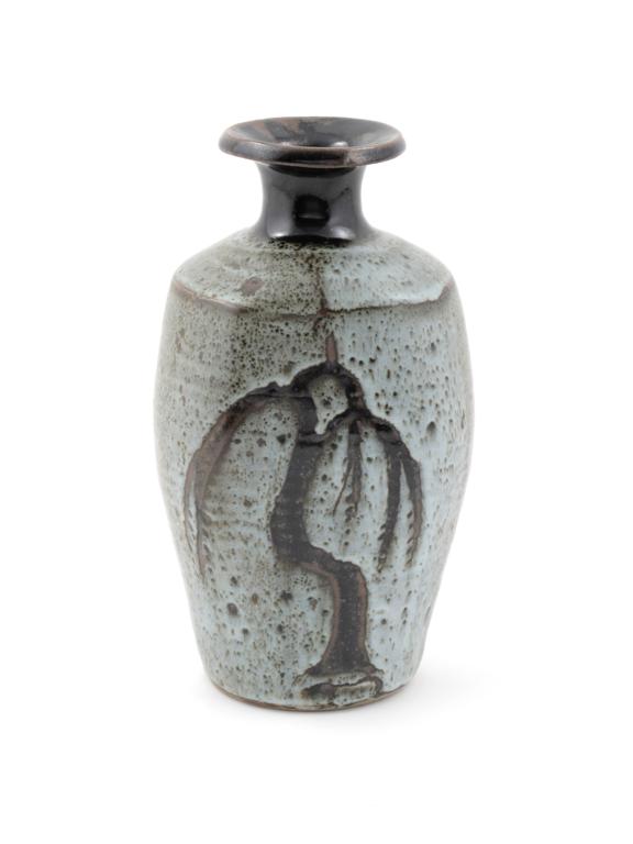 a stoneware shouldered vase, resist decorated with a willow tree motif in tenmoku on a celadon ground impressed seal mark 28.5cm. high