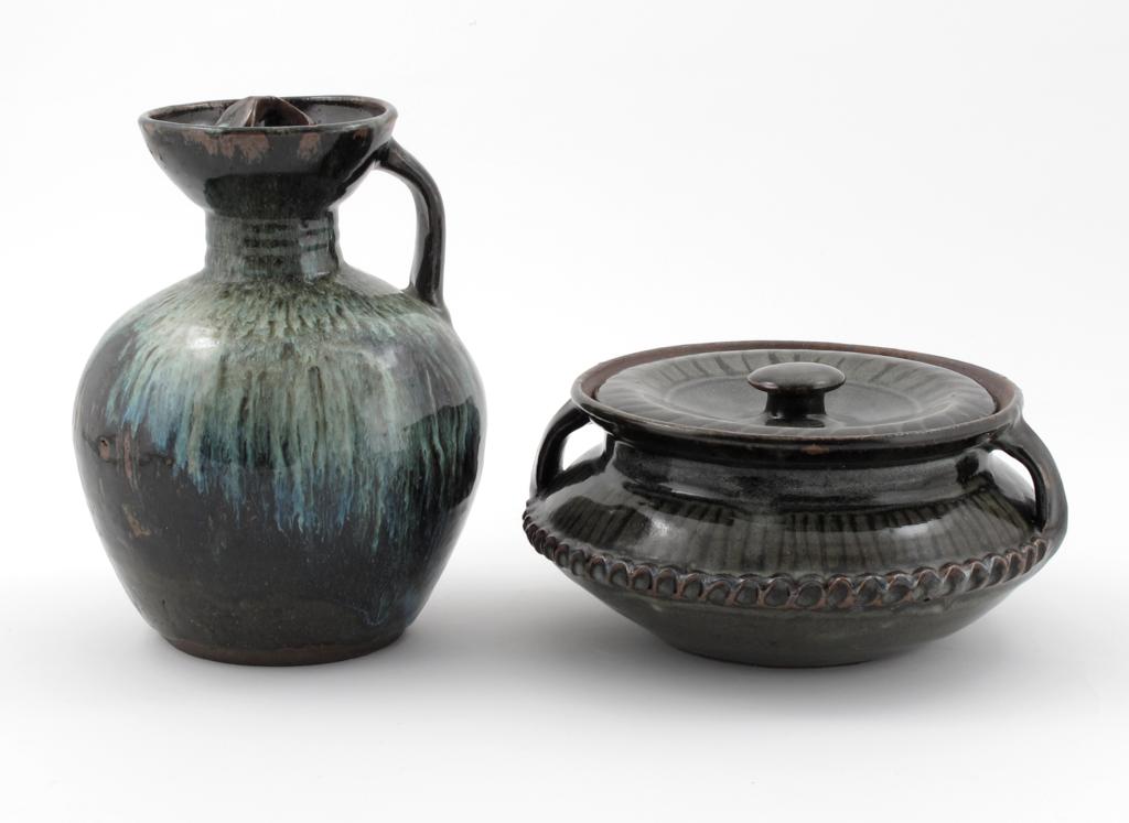 a large twin-handled tureen and cover with pie-crust rim, probably by Peter Gboko, glazed in ash, rust and tenmoku, and a Palm wine bottle and cover, and a collection of Abuja Pottery impressed seal marks, 23cm. diam.