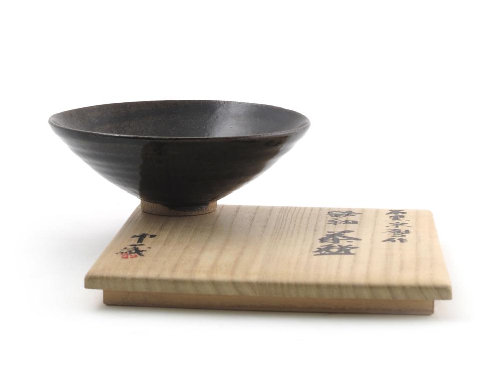 a Chawan (tea bowl) open summer form, glazed tenmoku to the foot, in original wood box impressed seal mark, 16.5cm. diam.