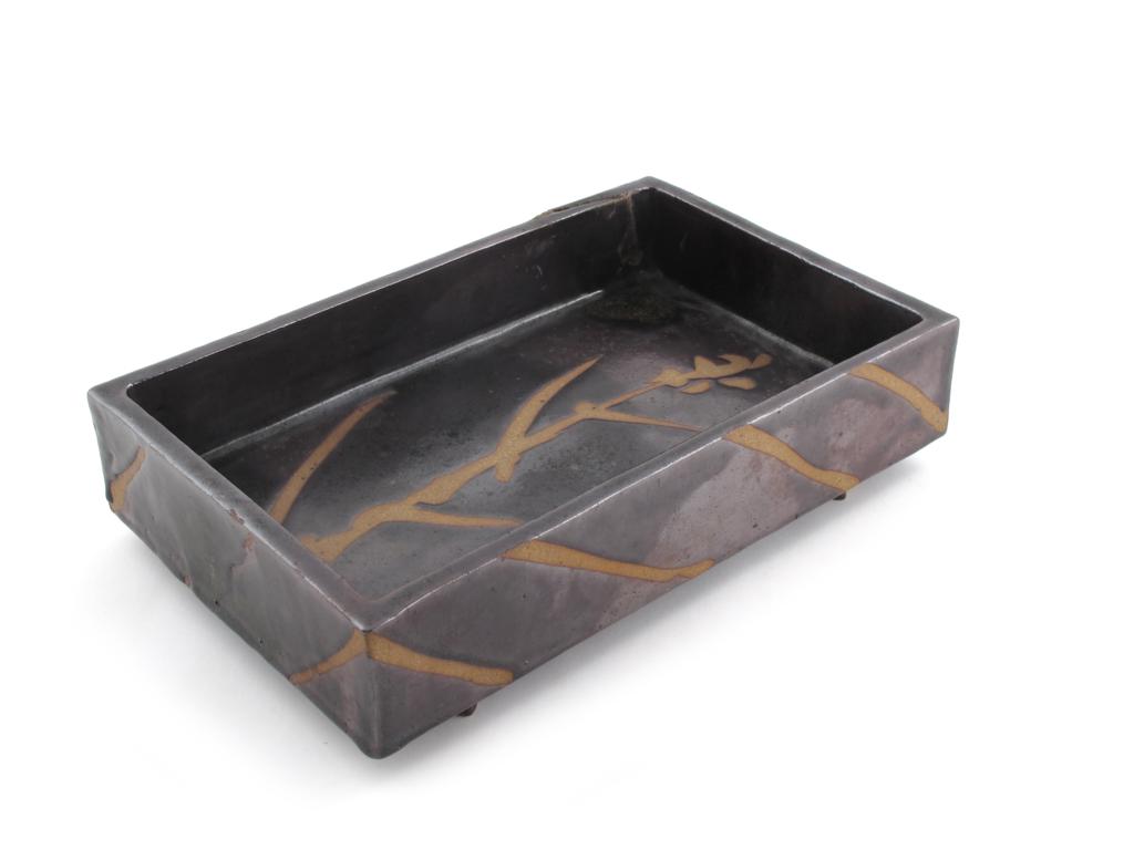 a large stoneware, rectangular hand built bowl, on four feet, resist decorated to the well with sugar cane motif under a kaki glaze, the exterior with diagonal brush strokes unsigned, firing crack repaired by Hamada to one corner,