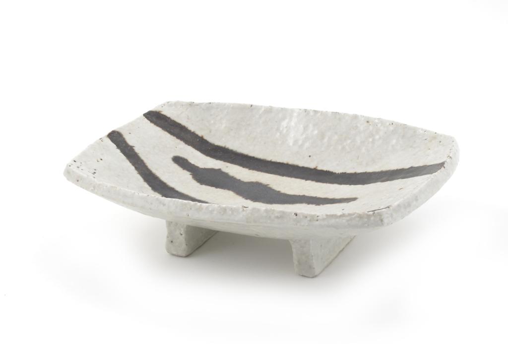 a Leach Pottery dish on slab feet, rectangular top resist decorated with three brush stroked in tenmoku on a white ground impressed seal marks 27cm. wide