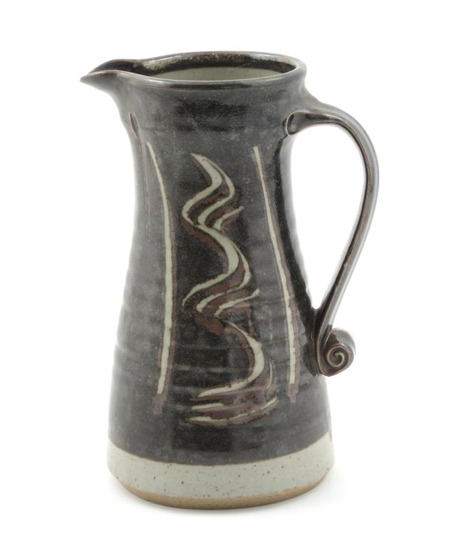 David Frith (born 1943) a stoneware jug with scroll handle, decorated with simple comb design impressed seal marks, 27cm. high