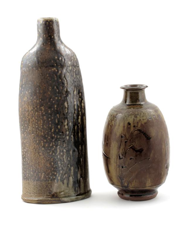 a shouldered vase, with collar neck, incised and painted with grass decoration, on an ash glaze and a tall shouldered vase covered in a running ash glaze impressed seal mark, chip to top rim 26cm. high