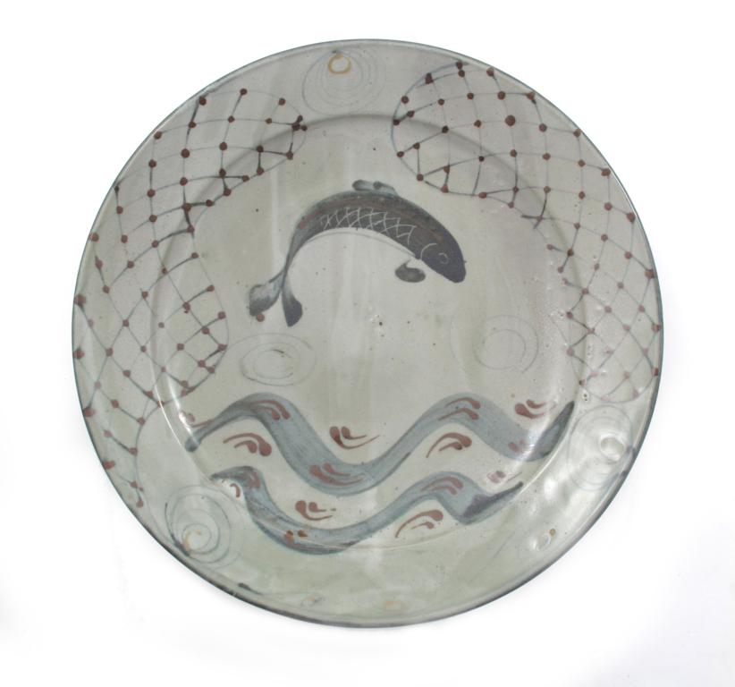 a Brookhouse Pottery stoneware charger, painted to the well with a leaping fish above waves, either side nets, in colours on a celadon ground impressed seal marks 41cm. diam.