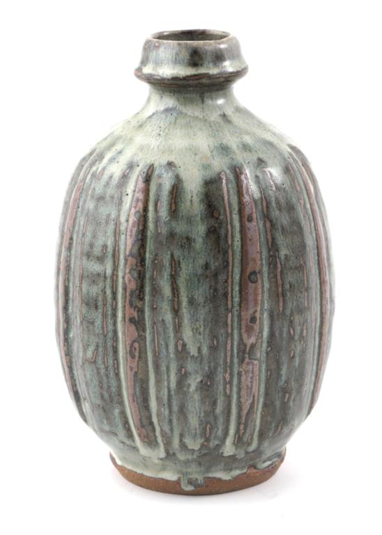 Mike Dodd (born 1943) a cut sided stoneware vase with knopped neck, covered in a running ash glaze impressed seal mark 24cm. high