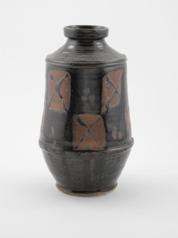 Mike Dodd ( born 1943) a tall shouldered stoneware vase, resist decorated with panel design in tenmoku and rust glazes impressed seal mark 35cm. high