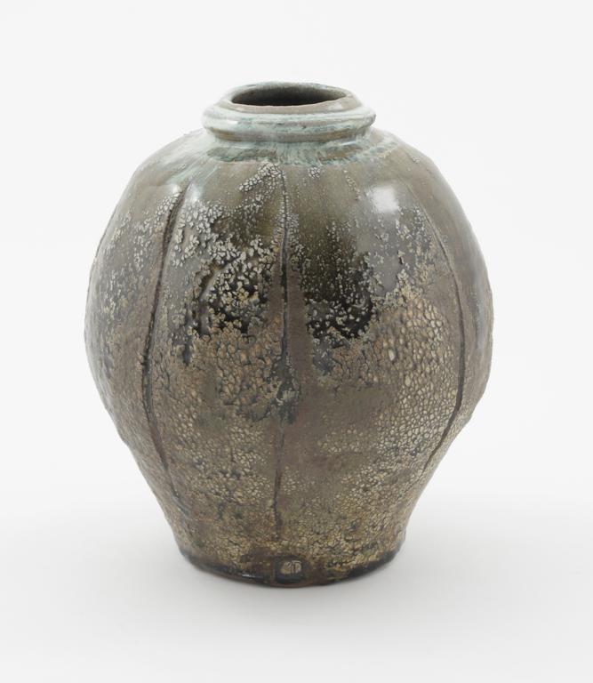 Mike Dodd ( born 1943) a shouldered stoneware vase, incised vertical fluted covered in a pitted ash salt-glaze impressed seal mark 25cm.,high