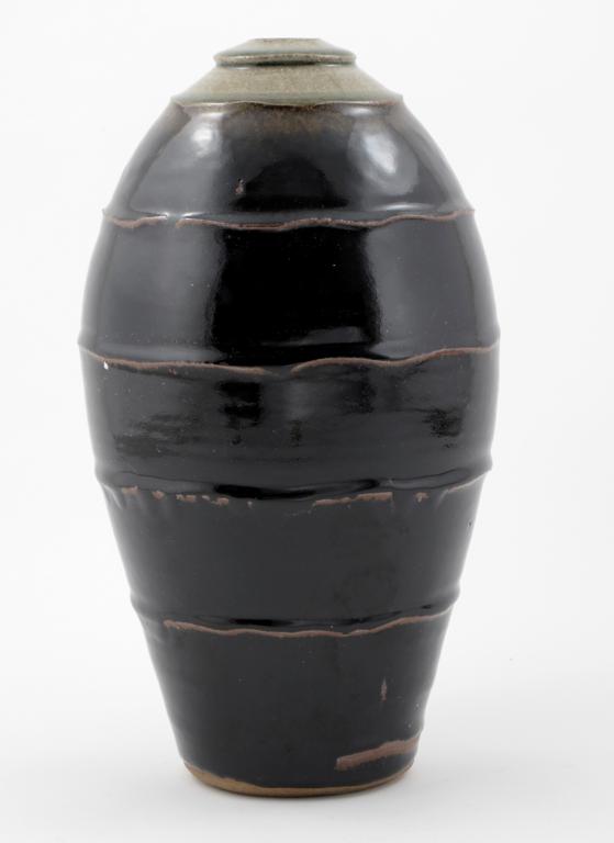 Mike Dodd (born 1943) a tall stoneware vase, incised banding, glazed deep tenmoku over celadon impressed seal mark 36cm. high