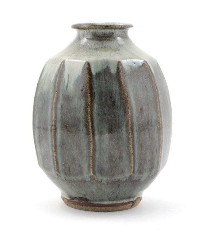Mike Dodd (born 1943) a small cut-sided vase, with collar rim, covered to the foot with an ash glaze impressed seal mark, 20cm. high