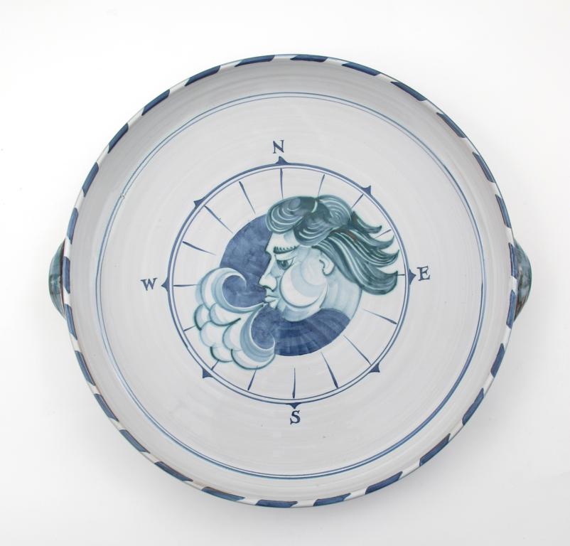 an Aldermaston Pottery larger platter, dated 1977, painted to the well with a Zephyr, in blue on a pale blue ground painted marks, 47cm. diam.