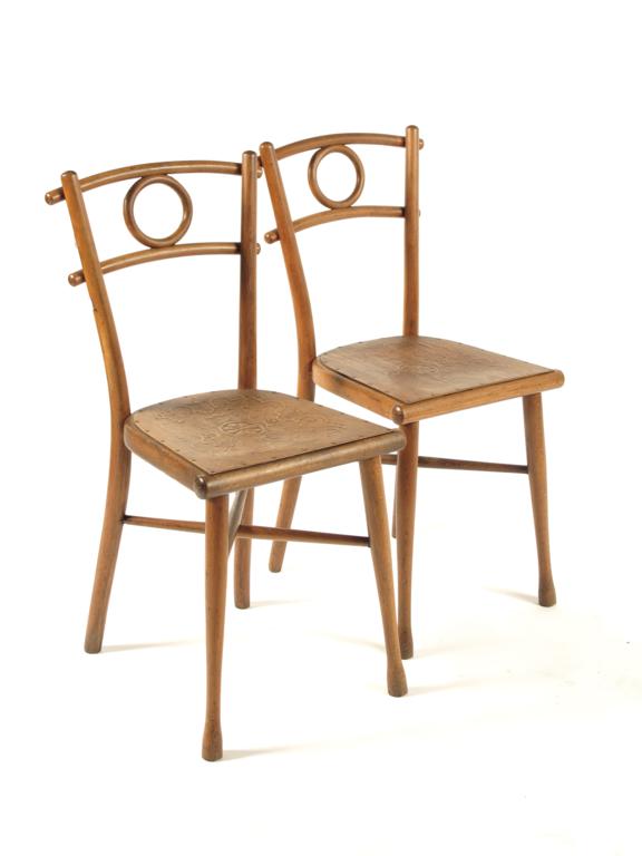 A pair of Thonet bentwood chairs, with faux tooled leather seats applied paper labels 86.5cm. high