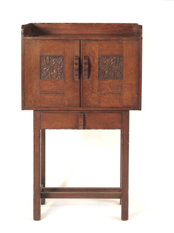 An Arts and Crafts oak cabinet, possibly Lake District, the rectangular cabinet with carved panel, hinged doors above a shelf, the legs and back plate with carved scallop decoration, unsigned