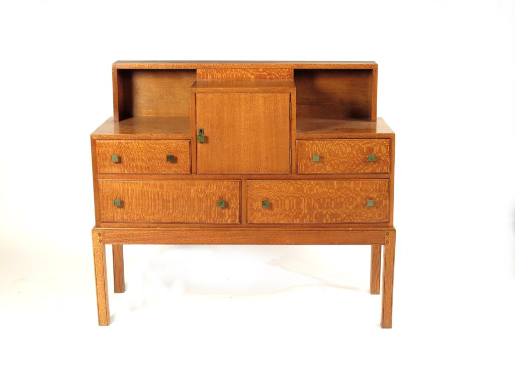 A Bath Cabinet Makers weathered oak sideboard, designed by Charles Richter, with central hinged cupboard flanked by four drawers, with green bakelite handles 120 x 43cm.