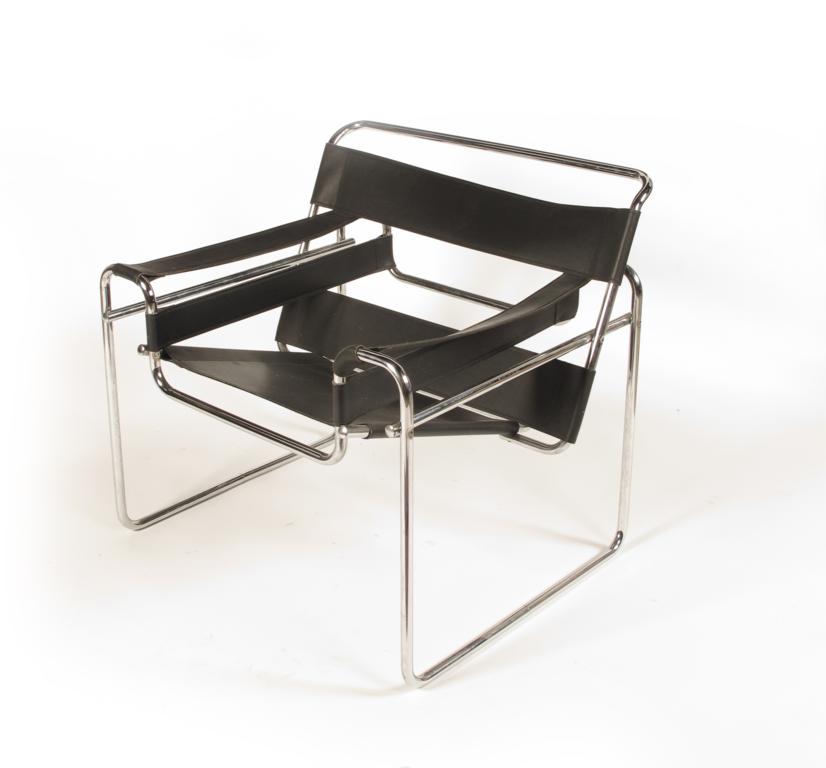 A chrome metal and black leather B3 Wassily chair, originally designed by Marcel Breuer 78cm. wide
