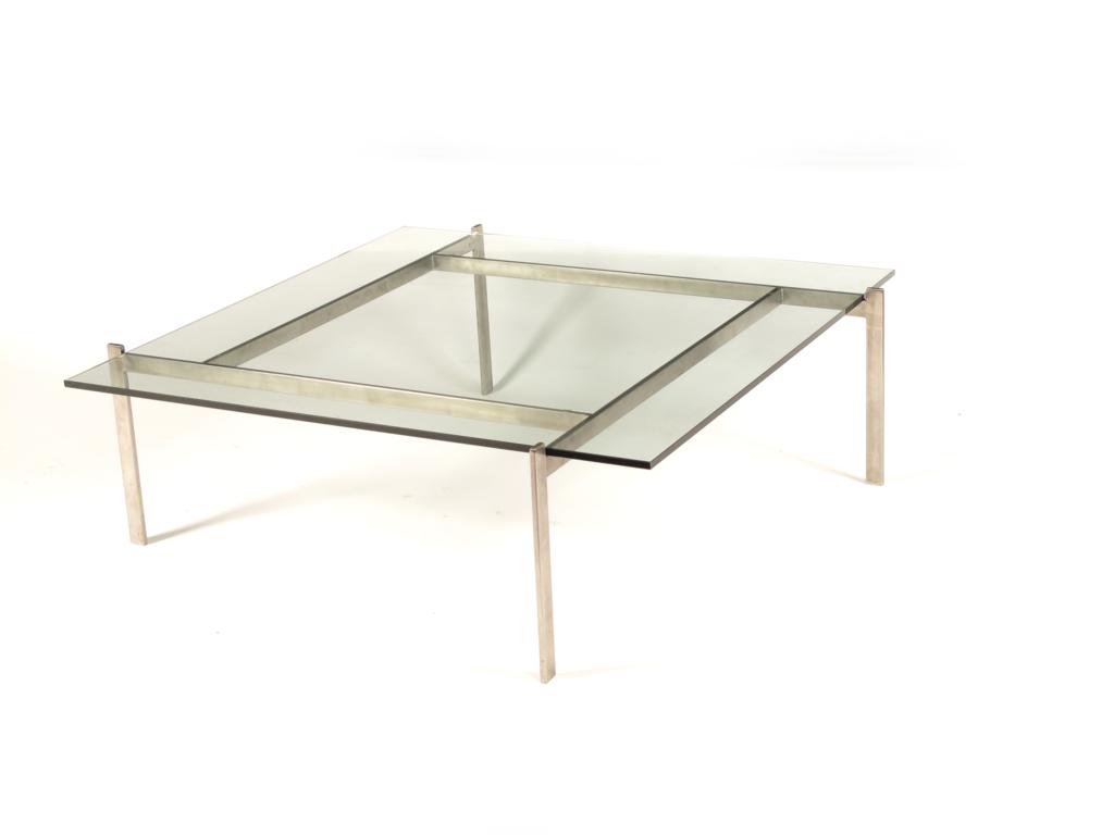 A steel framed PK61 occasional table originally designed by Poul Kjaerholm, with square glass top unsigned 100cm. square