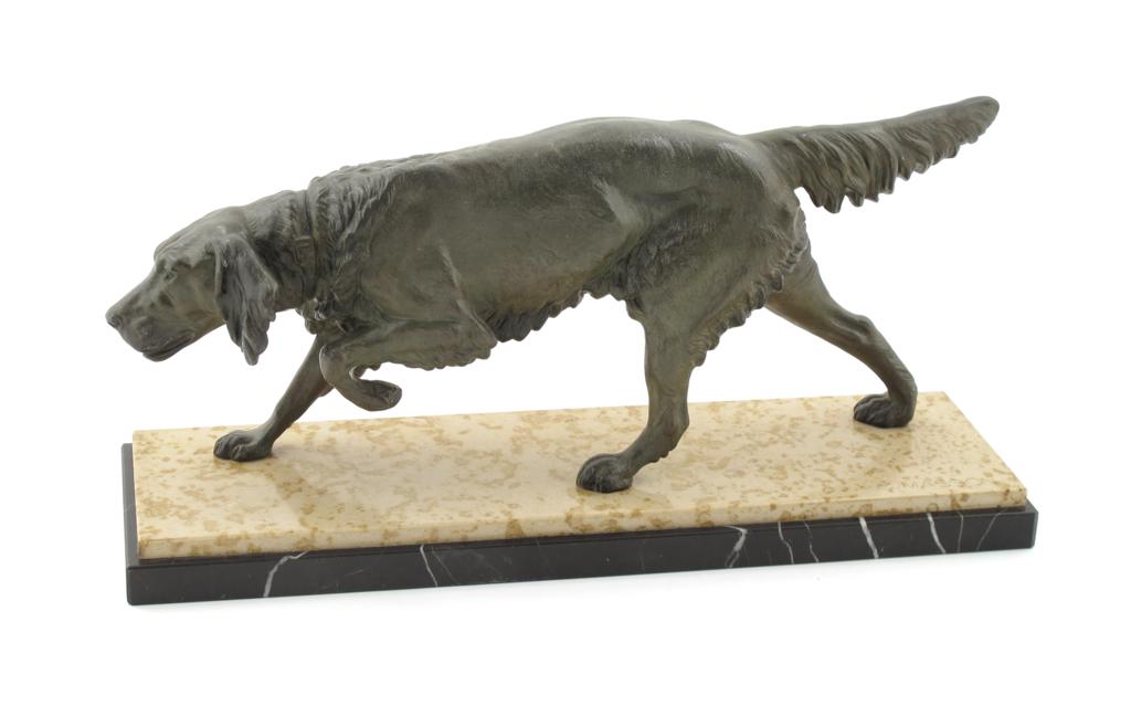 A patinated spelter sculpture of a hound on the scent
