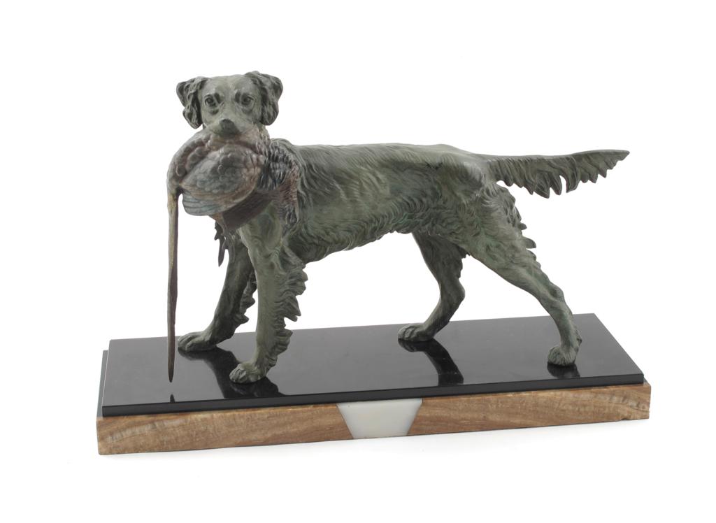 A patinated spelter model of a dog with a pheasant, cast from a model by Jules Moigniez (1835-1894), on rectangular base signed in the base 45cm. wide