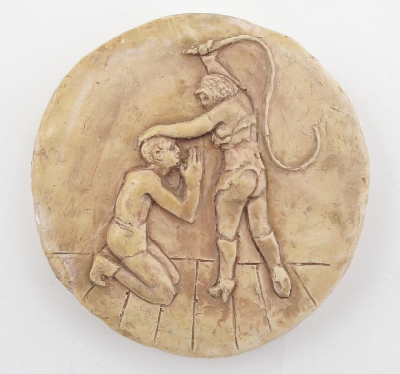 Flagellation, a plaster roundel, dated 1981, signed EP dated 1981 12cm. diam.