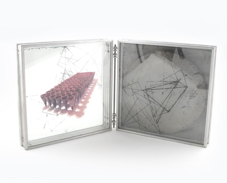 ‡Theodoulos Gregoriou composition diptych, 1992, aluminium, printed glass and concrete numbered 40 of 50 etched signature and date 32 x 33cm.