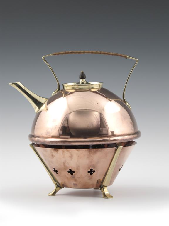 A W.A.S Benson Windguard copper and brass kettle on a stand