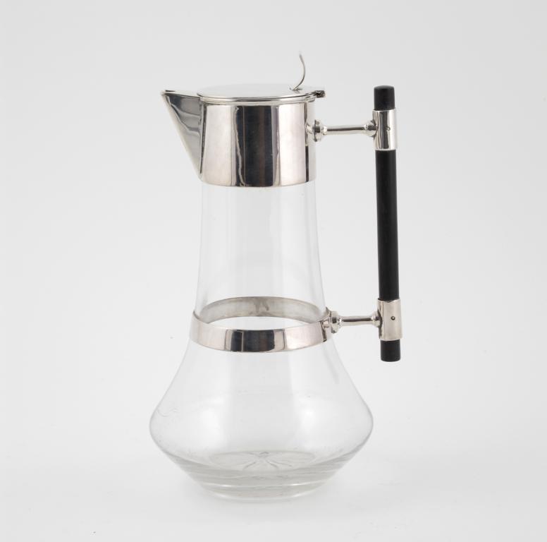 An electroplated glass claret jug the design attributed to Dr Christopher Dresser, with ebonised wood bar handle, the collar with hinged cover unmarked 25.5cm. high