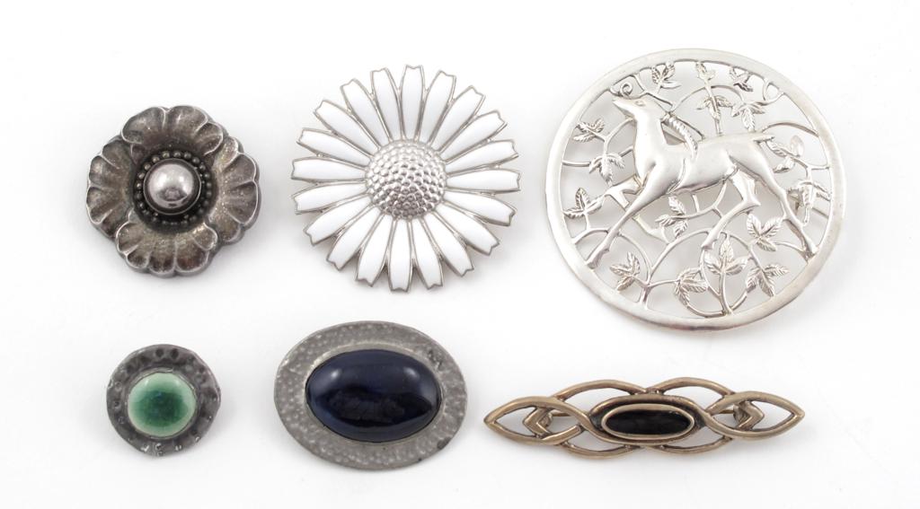 A silver brooch by Georg Jensen, model no.189, cast as a flowerhead, a Georg Jensen enamelled flower brooch and four other brooches stamped marks, 3cm. wide