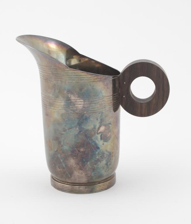 An Art Deco Ravinet D'enfert white metal and rosewood jug, cylindrical form with turned band decoration, on similar foot, applied with ring handle stamped marks, 18cm. high