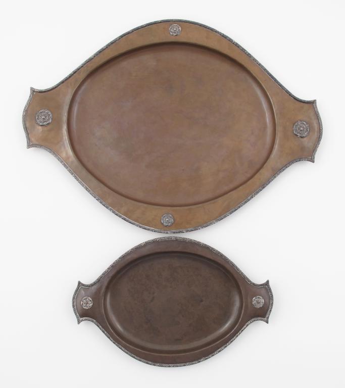 An A E Jones patinated copper tray, model 2439, twin-handled elliptical section, applied with silver Tudor rose motif and garland rim, and another smaller stamped mark 39cm. wide