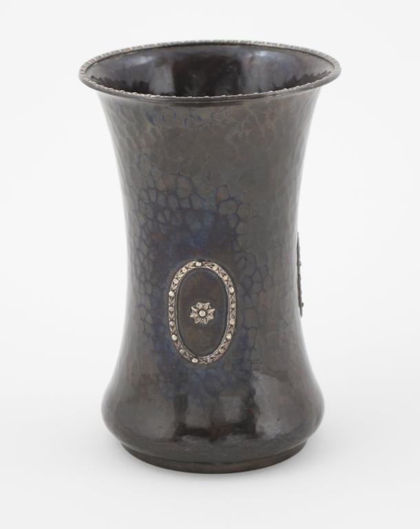 An A E Jones patinated copper vase, model no.2468A, waisted cylindrical form, applied with silver flowerhead design inside garland border, the rim with similar border stamped mark, 14.5cm. high