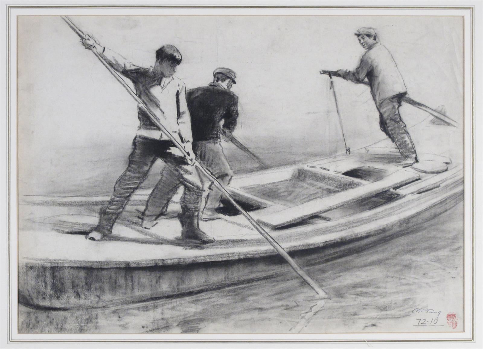 Muli Tang (Chinese b. 1947) Three workers on a punt; Workers delivering milk Two