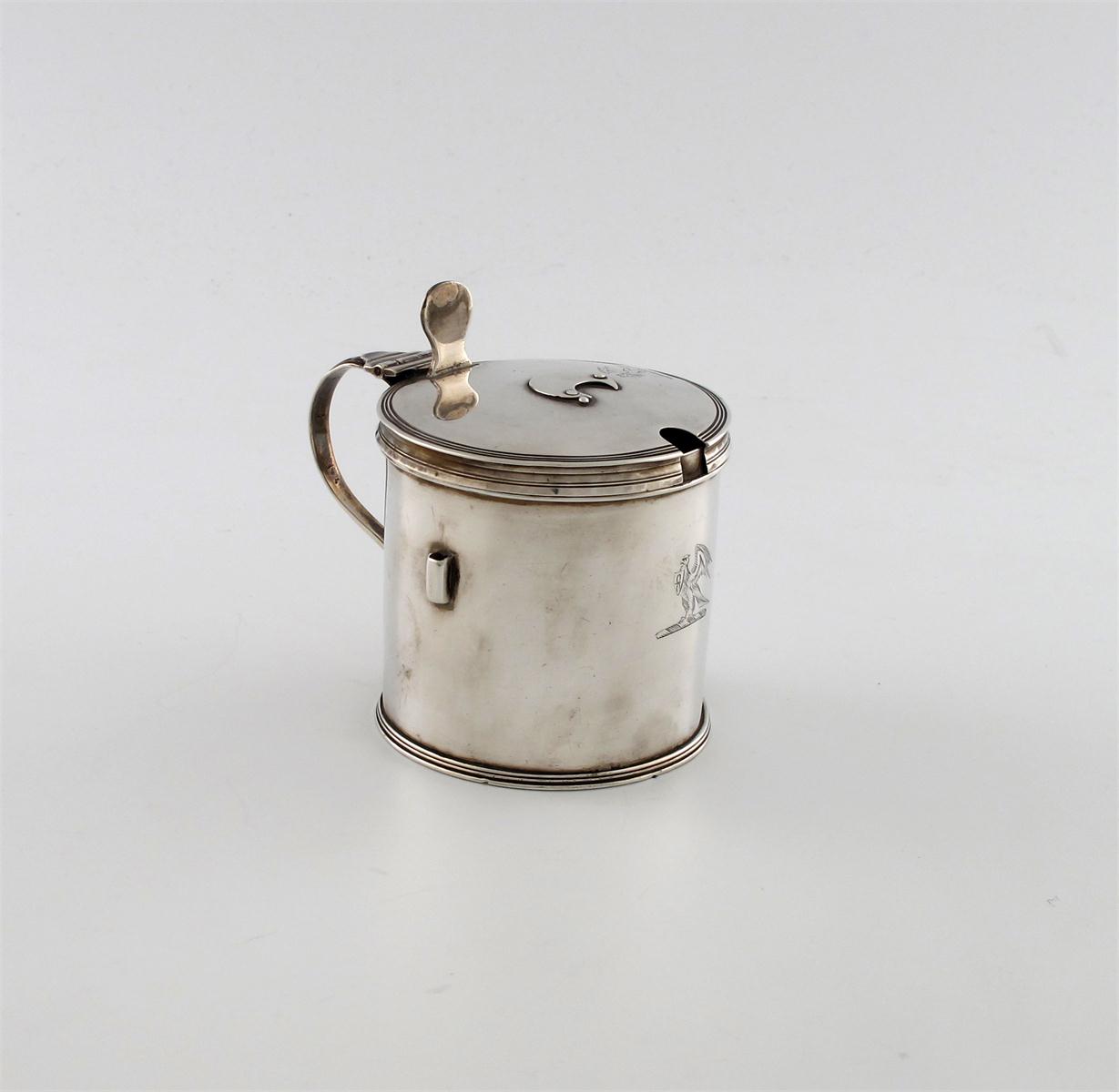 circular drum form, scroll handle, the hinged cover with a slide action cutter, and a later hole for a mustard spoon, engraved with a crest, height 8cm, approx. weight 4oz.