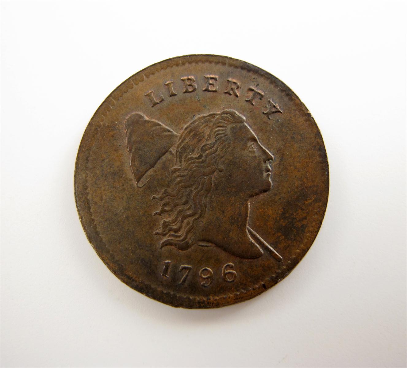 United States of America, Half-Cent, 1796, Liberty head to right with long flowing hair, behind her a pole on which rests a Phrygian or Liberty cap, LIBERTY above, 1796 below, rev. value HALF CENT within an open wreath of olive the stems tied with a ribbon and below 1/200, UNITED STATES OF AMERICA around, beaded border to both sides, plain edge, 5.49gms (Cohen 2*). Extremely fine and, with a mintage of only 1390 specimens, a coin of exceptional rarity.