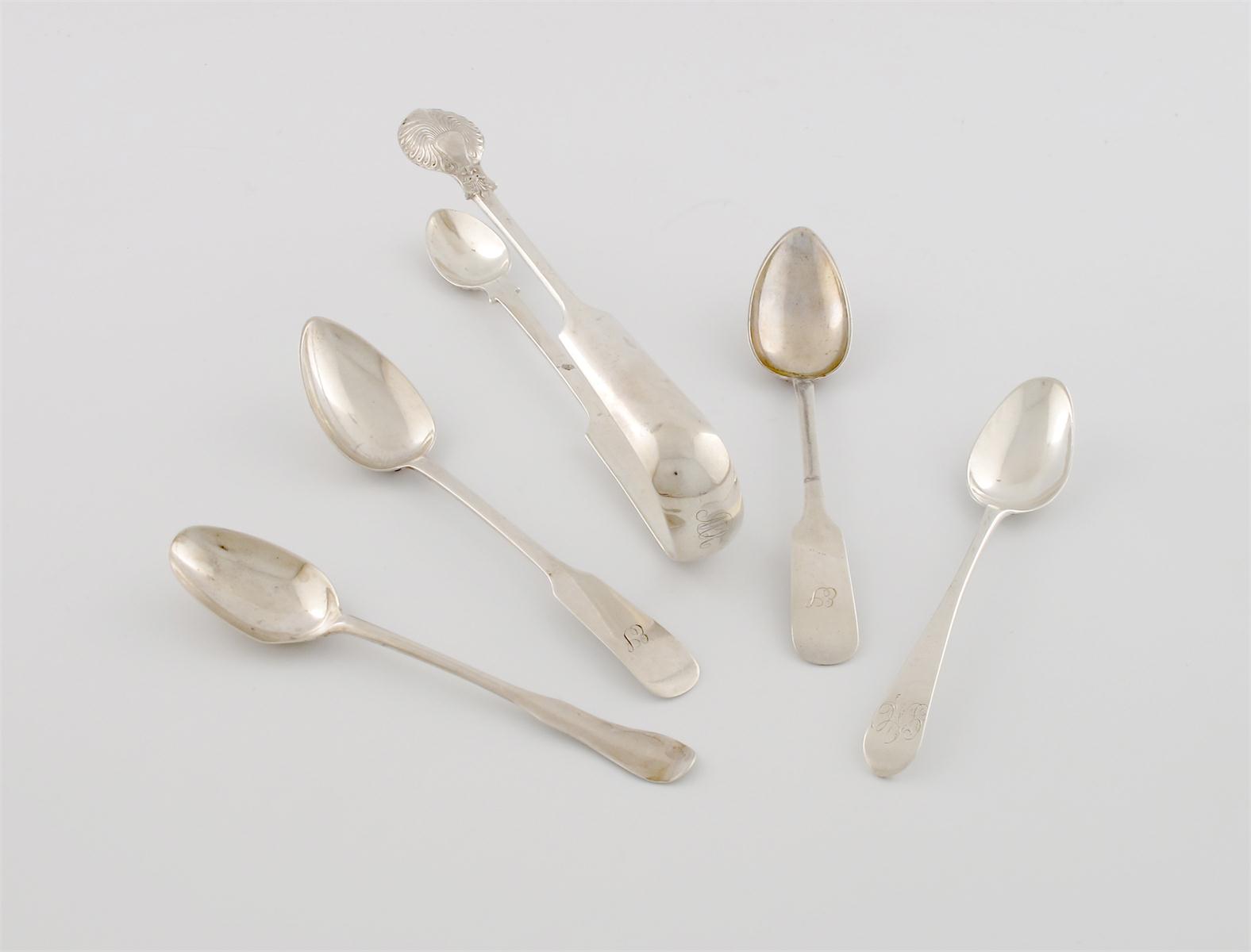 comprising: a pair of early 19th century provincial Fiddle pattern teaspoons, by David Manson, Dundee circa 1810, the terminals with script initials, plus two further teaspoons and a pair of sugar tongs, Glasgow 1848, approx. weight 3.2oz. (5)