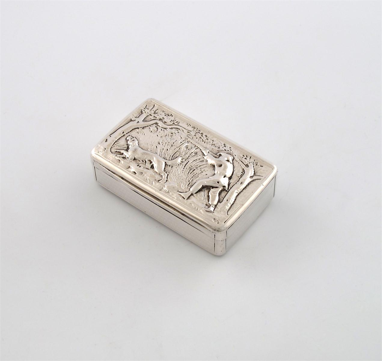 rectangular form, the hinged cover embossed with a shooting scene, in a woodland scene with a gun dog below, engine-turned sides and foliate base, length 7.4cm, approx. weight 2.9oz.