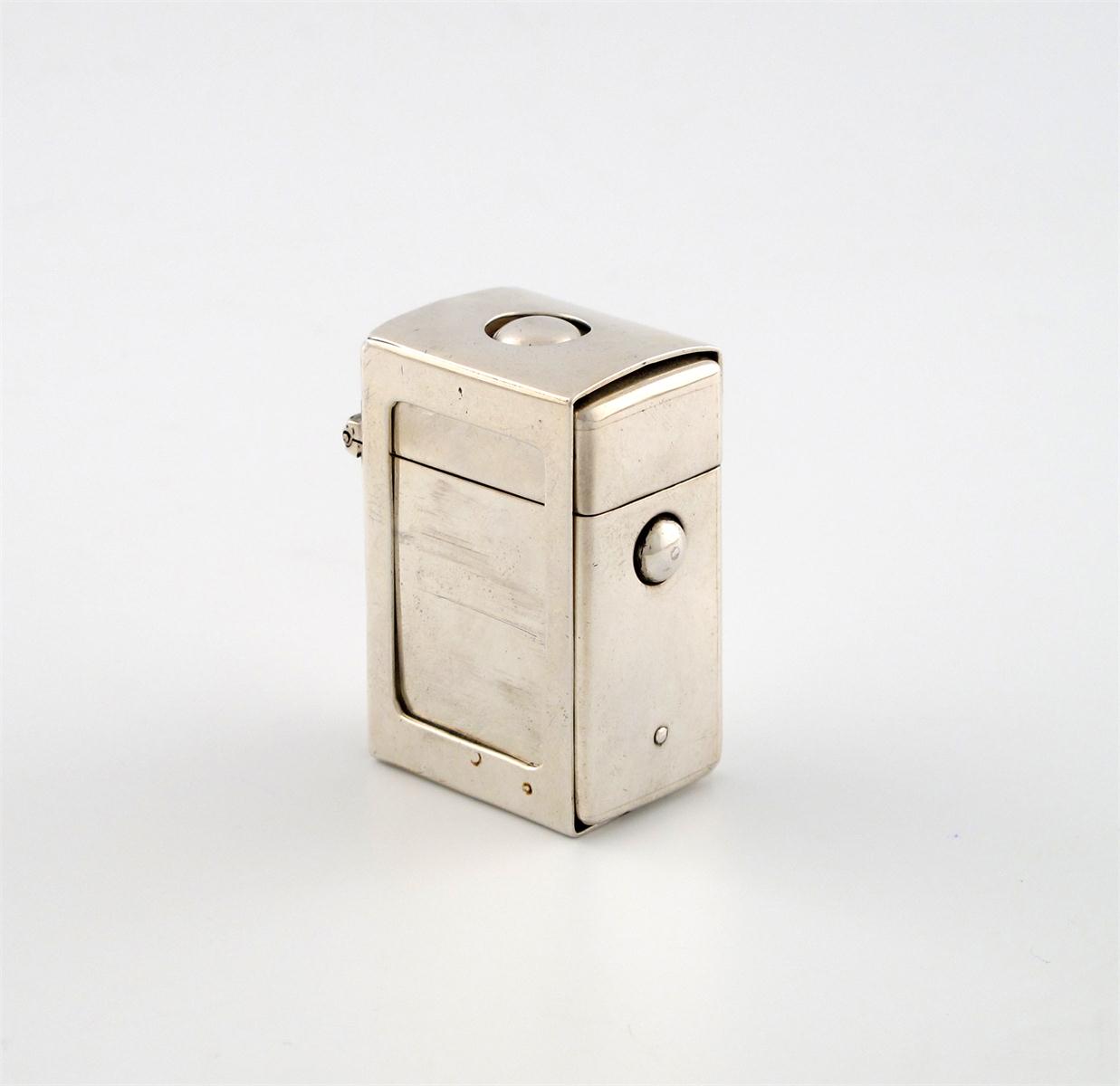 rectangular form, hinged cover with a push-action clasp, with a glass liner, and with an outer silver slide off case, approx. weight 3oz, height 5.2cm.