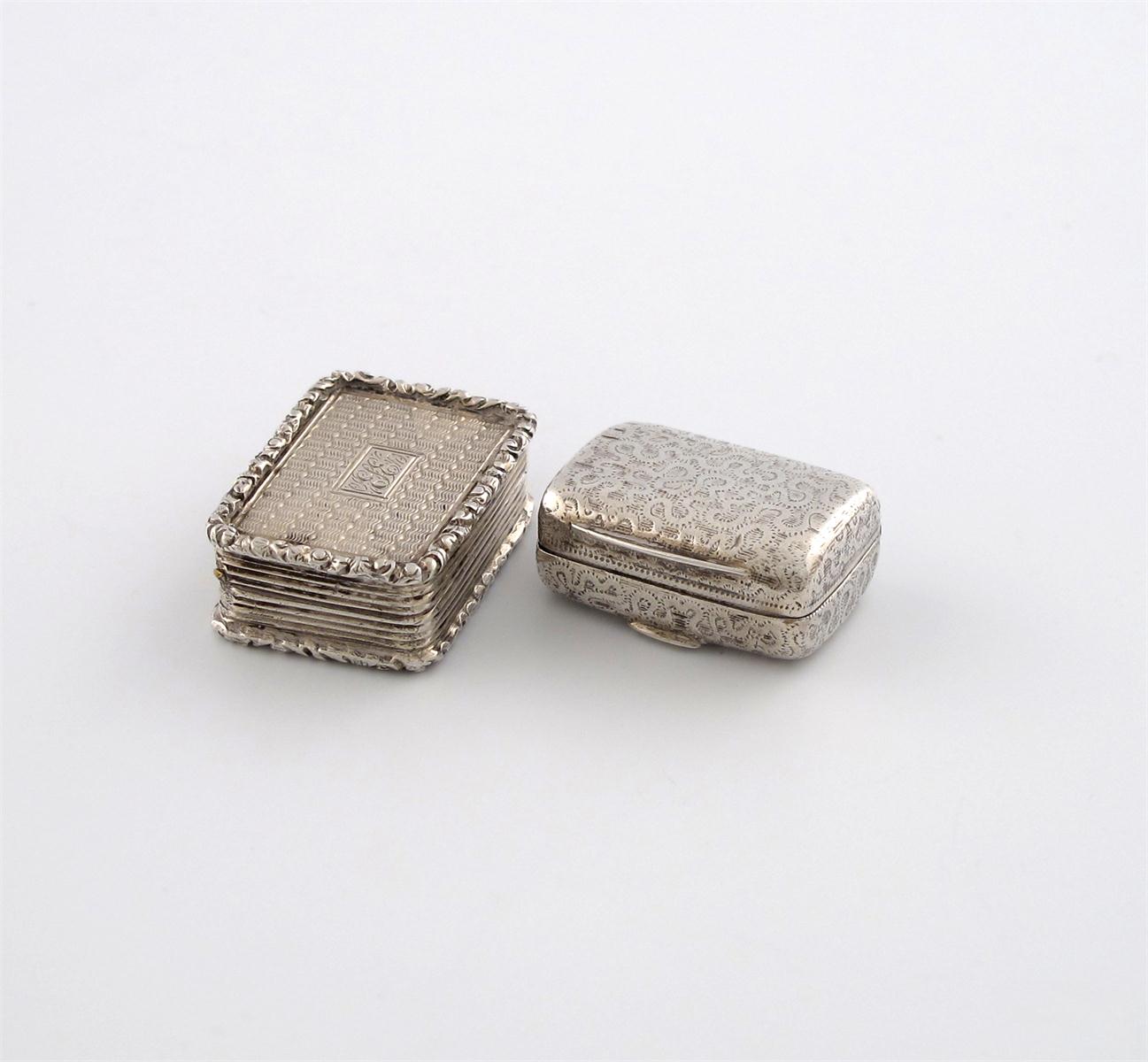 rectangular form, foliate scroll borders, engine-turned decoration, plus a George IV silver vinaigrette, London 1826, wriggle-work decoration, approx. weight 1oz. (2)