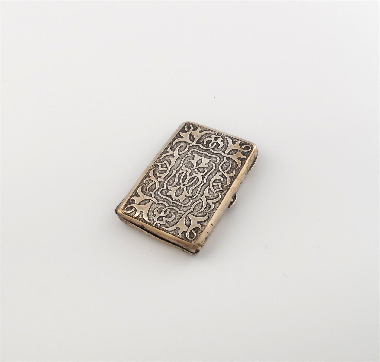 rectangular form, the front chased with stylised decoration on a matted background, the reverse with a monogram, fitted interior, length 10.5cm, approx. weight 4oz.