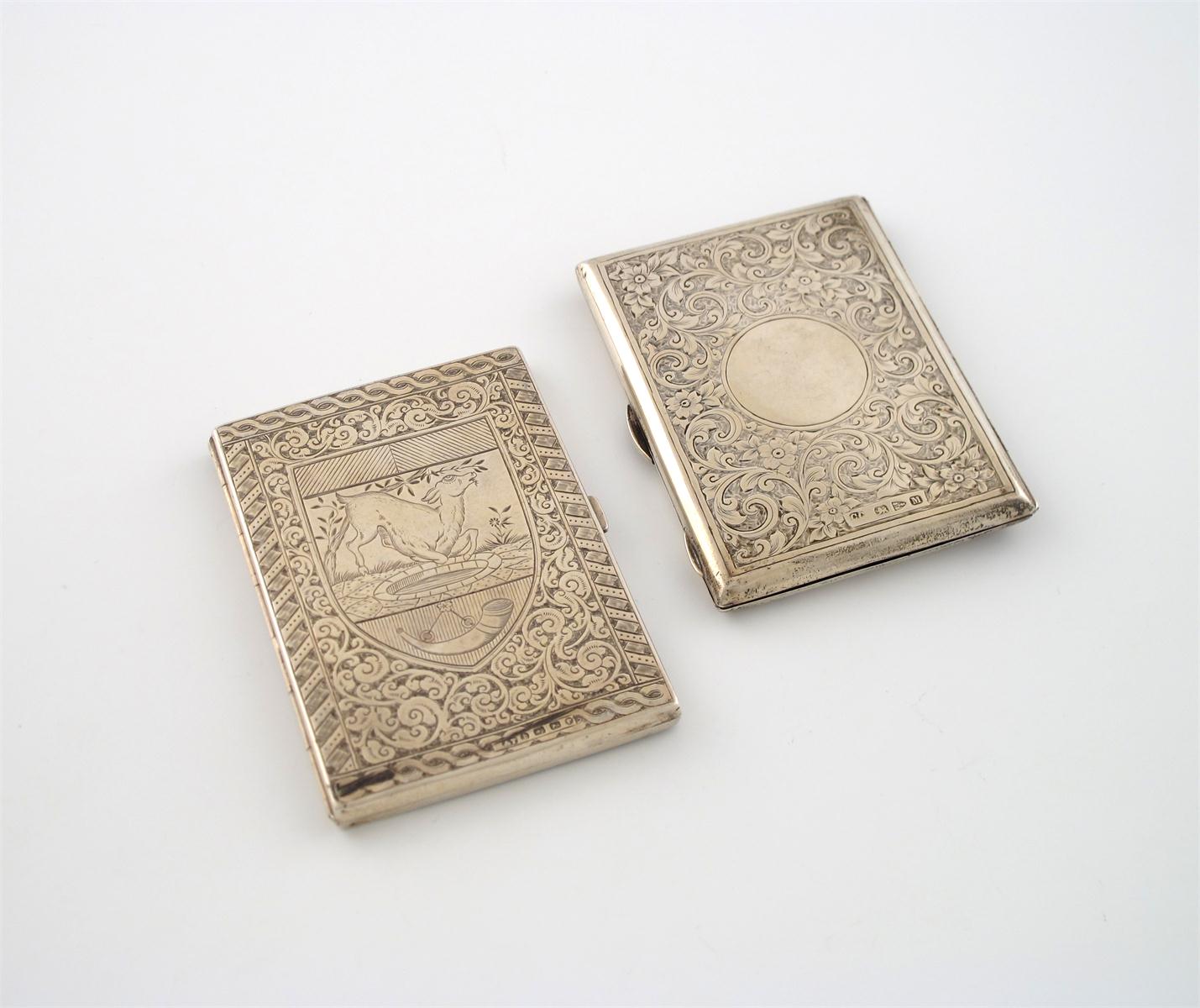 rectangular form, engraved with an armorial shield with a deer drinking from a well, the interior converted for cigarettes, plus a late-Victorian silver card case, engraved foliate scroll decoration, Chester 1895, approx. weight 5oz. (2)